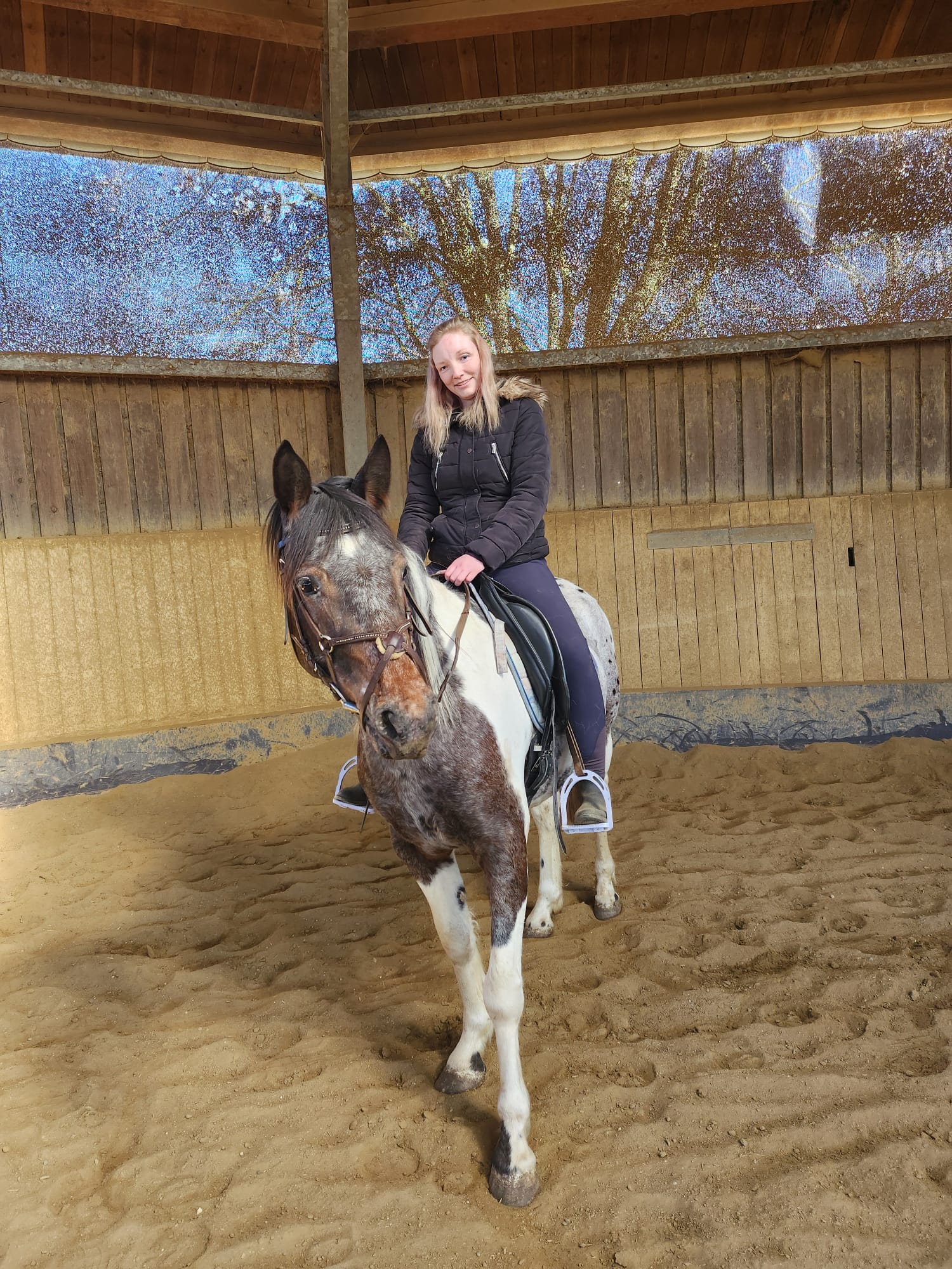 Beim Ausreiten war sie bereits mehrmals dabei und läuft brav bei einem erfahrenen Begleitpferd mit – durch etwas Routine wird sie auch hier bald ein sicherer Partner werden.