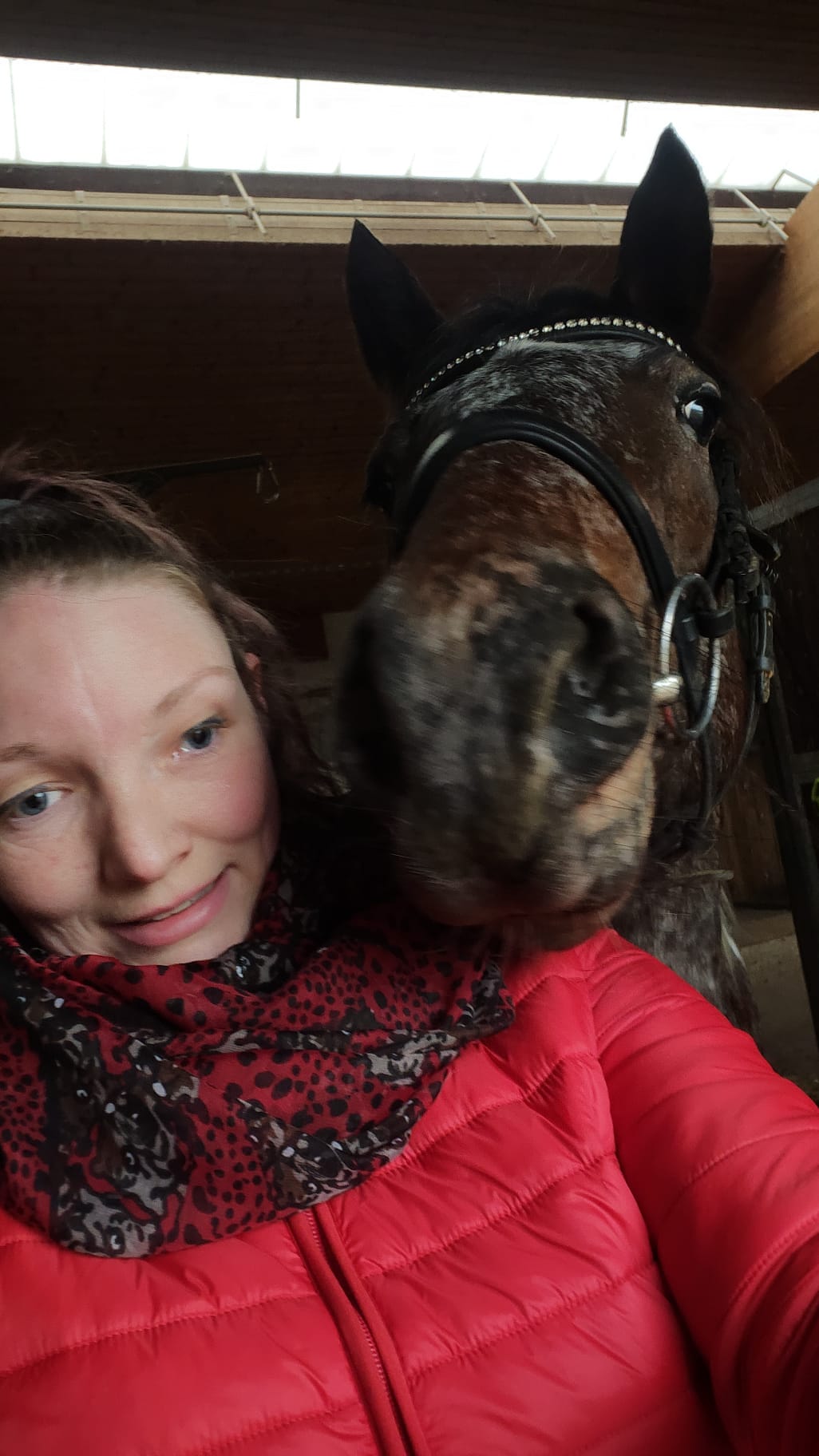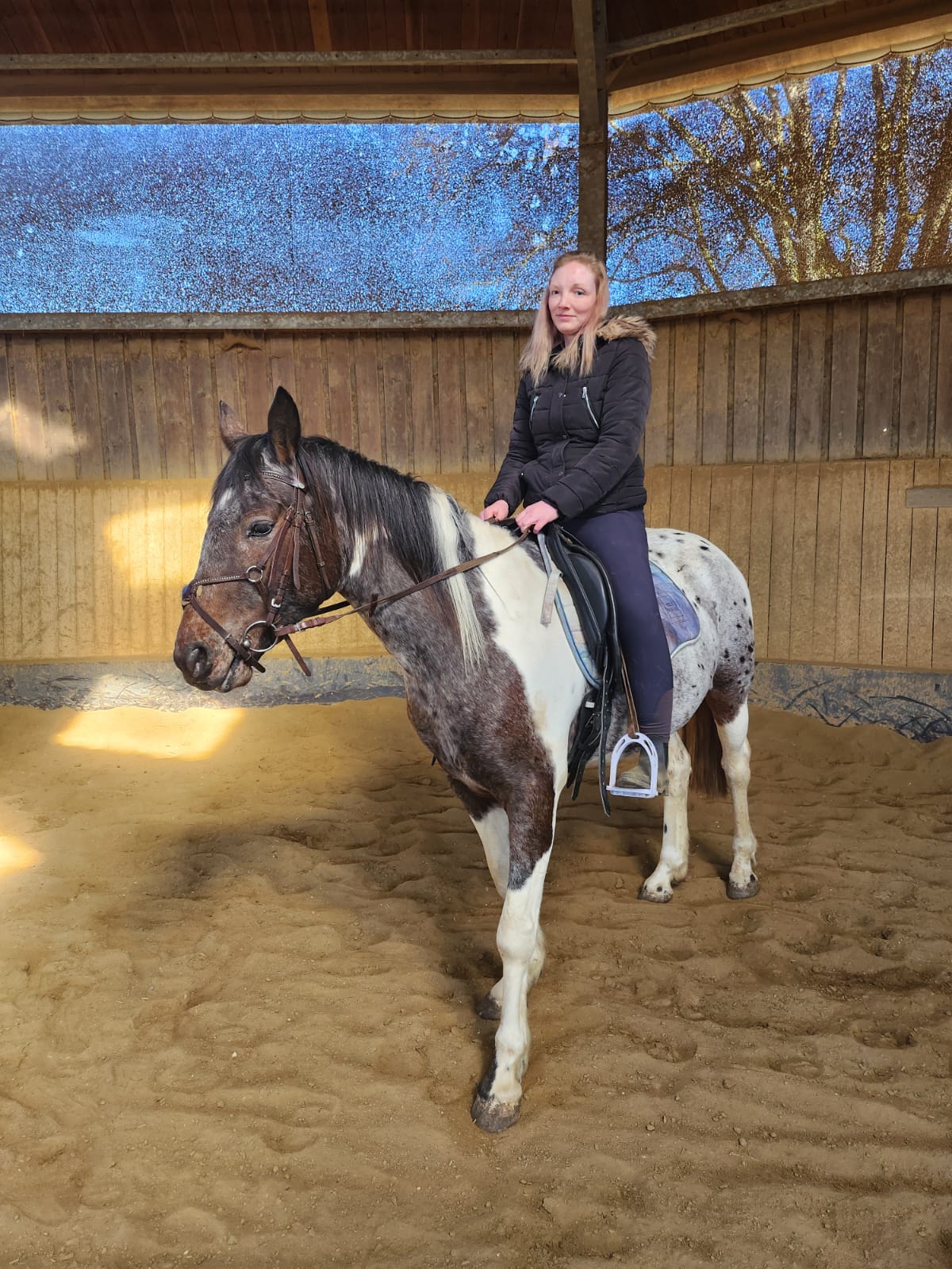 Sie liebt Spaziergänge, steht ruhig beim Putzen sowie Schmied und arbeitet sehr konzentriert in der Bodenarbeit.
